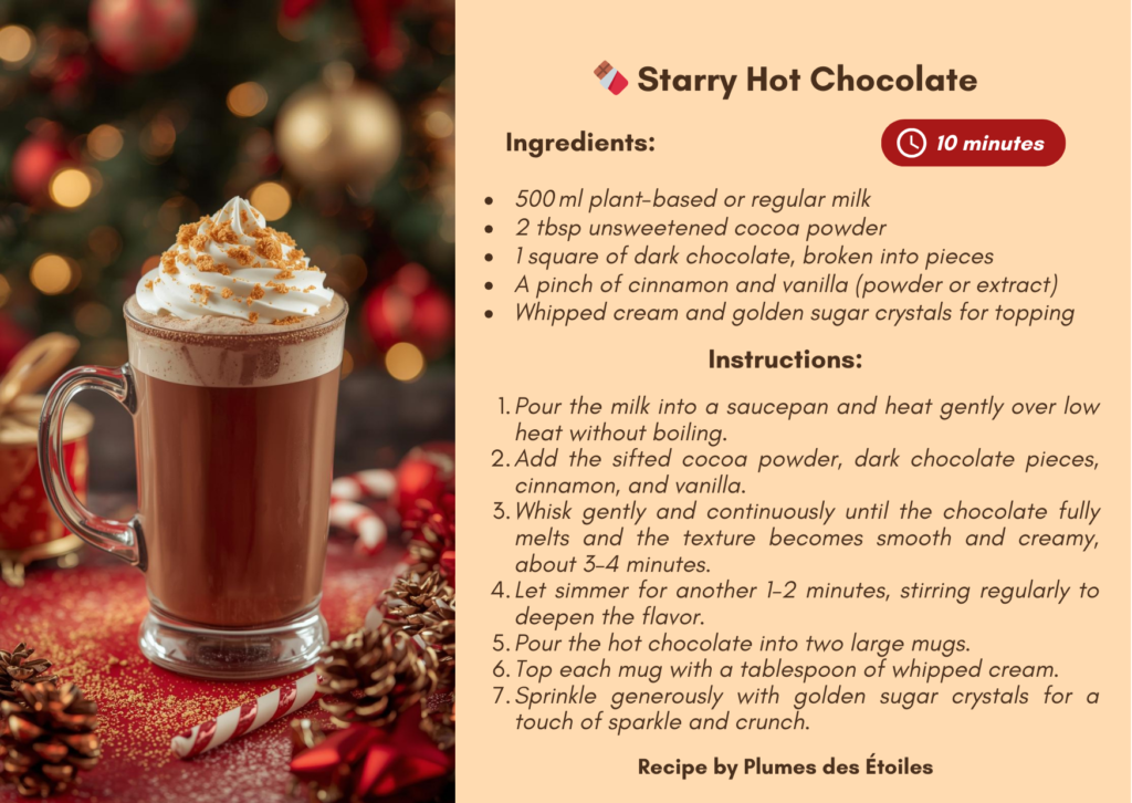 Listen to the whisper of stars melting in your cup. The Starry Hot Chocolate caresses the throat and warms the soul. Creamy, gentle, with a hint of vanilla and cinnamon, it transforms a winter evening into a moment of pure magic. ✨ A comforting, creamy hot chocolate sprinkled with magic and stardust to brighten your winter nights.