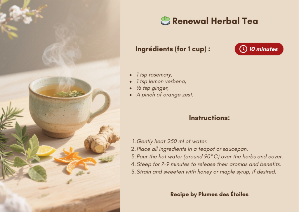The Renewal Herbal Tea is a ritual infusion inspired by ancestral plant wisdom. It supports transitions, nourishes vital energy, and invites mindful slowing down. More than a warm drink, it becomes a moment of centering — a simple gesture to honor change.